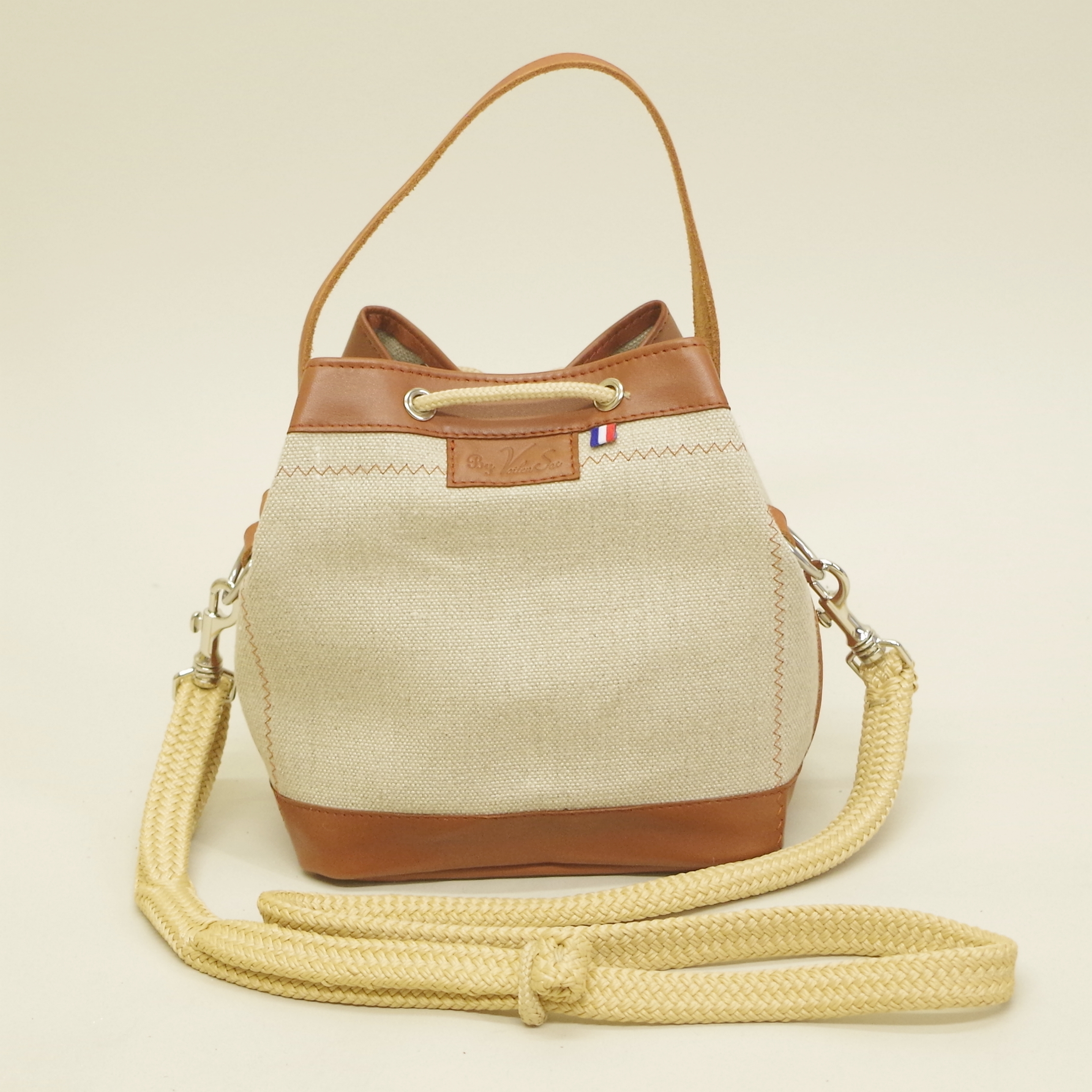 Sac seau en Lin et cuir d’agneau de Millau Lin cultivé et tissé en France, traitement imperméable, Utilisé pour la confection des voies de La Frégate l’Hermione, Porté main ou épaule, Anse main en cuir de vachette, bandoulière en gaine épissée, Une poche zippée et une poche téléphone, Cordon de serrage en cordage marin, passant cuir, Base: 19 cm X 14 cm, hauteur 21 cm