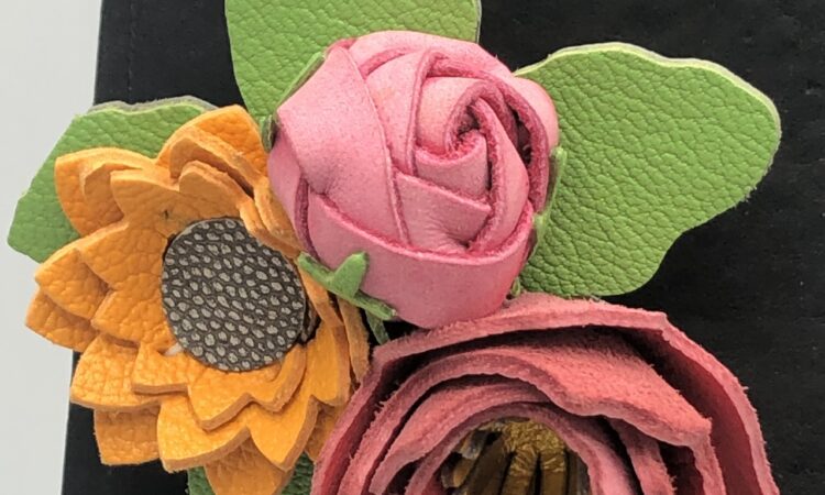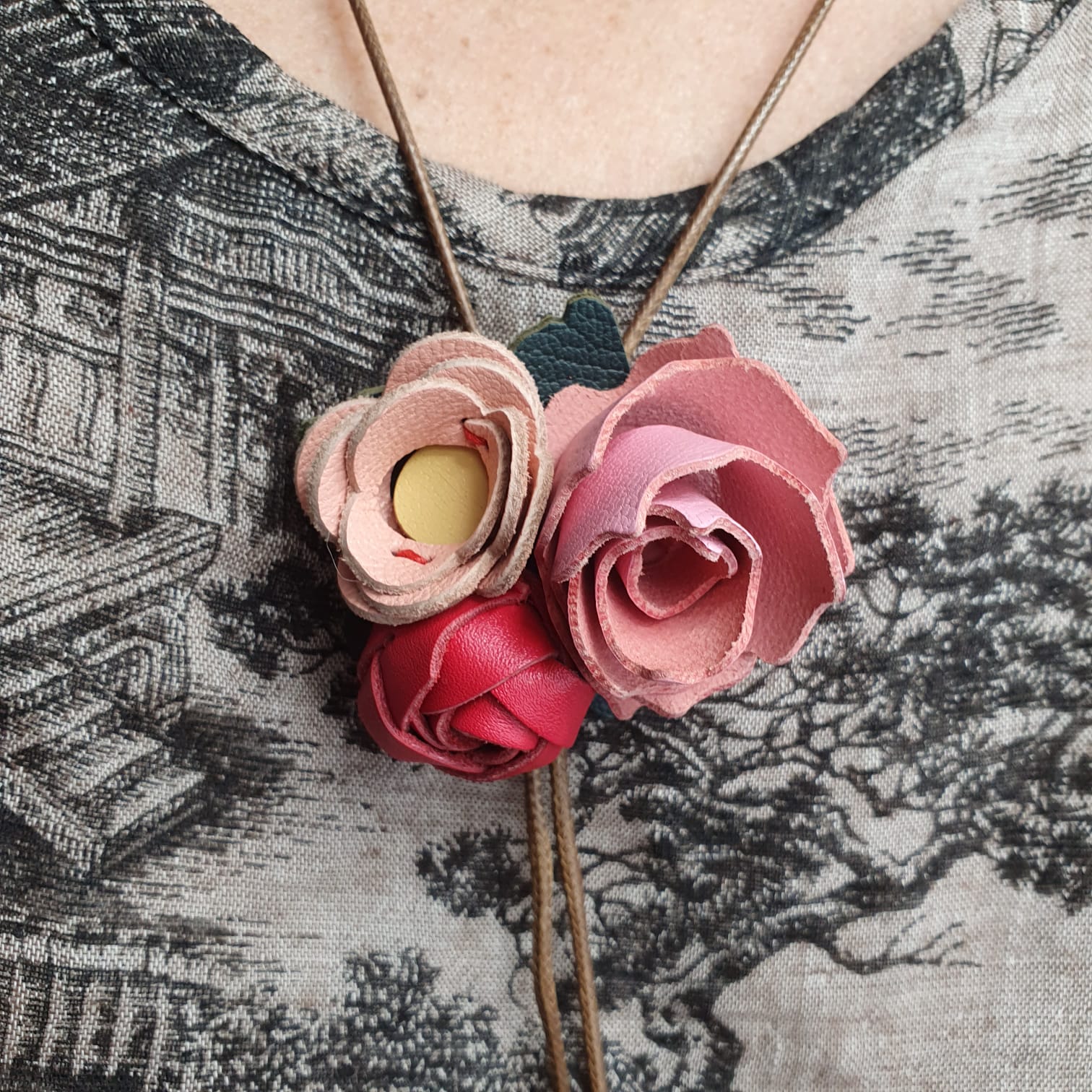 Collier composé de 3 fleurs de cuir en médaillon, cette composition peut être portée en broche, en sautoir ou en bracelet.