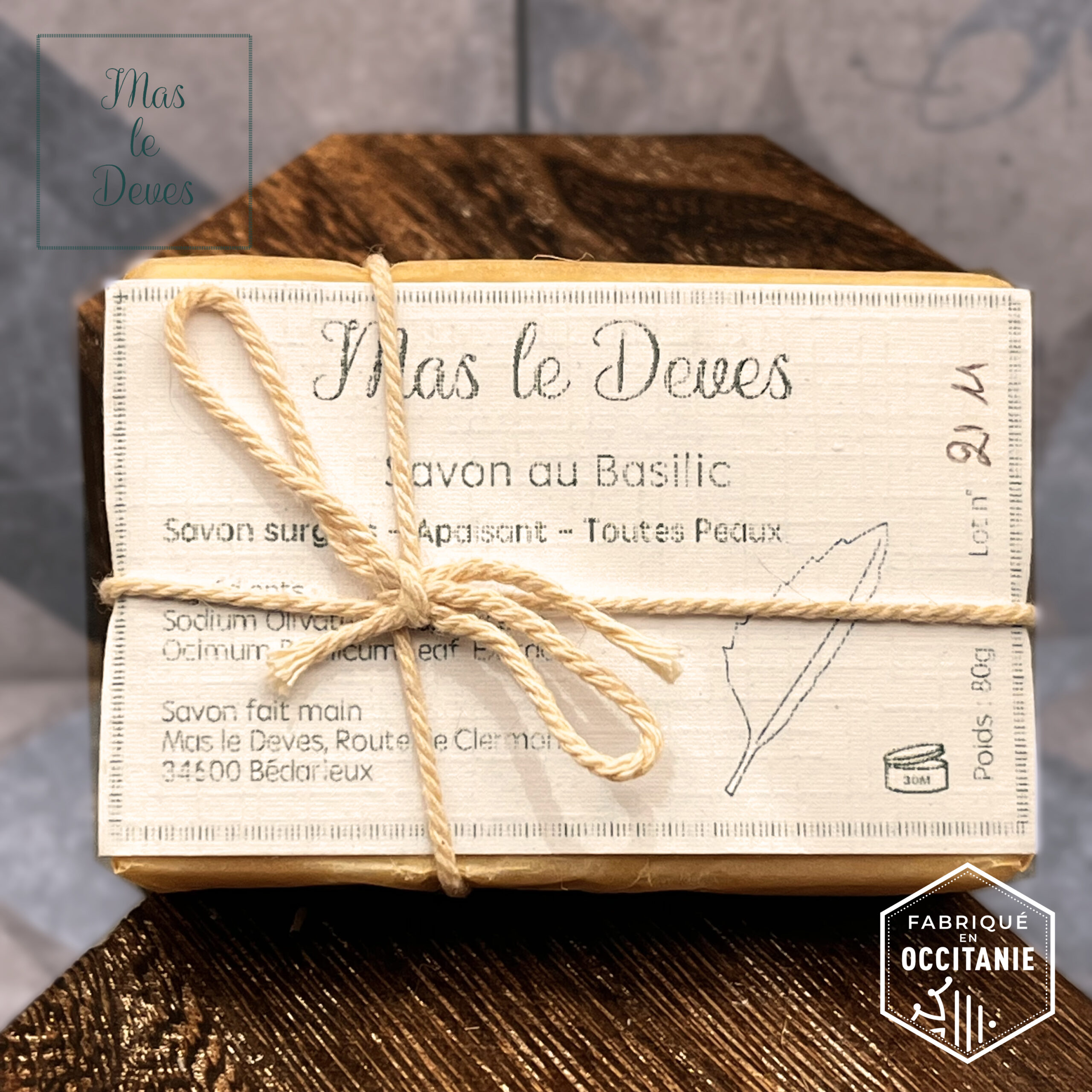 Savon artisanal naturel au Basilic – Haut-Languedoc Savon surgras saponifié à froid, fabriqué à la main et séché naturellement à l’air libre. Enrichi en feuilles de basilic macérées longuement dans de l’huile d’olive. Sans huile essentielle ni conservateur. Convient à tous les types de peaux, même sensibles. Utilisable sur le visage et le corps. Fabrication artisanale locale, à partir de plantes cueillies ou cultivées sur place.