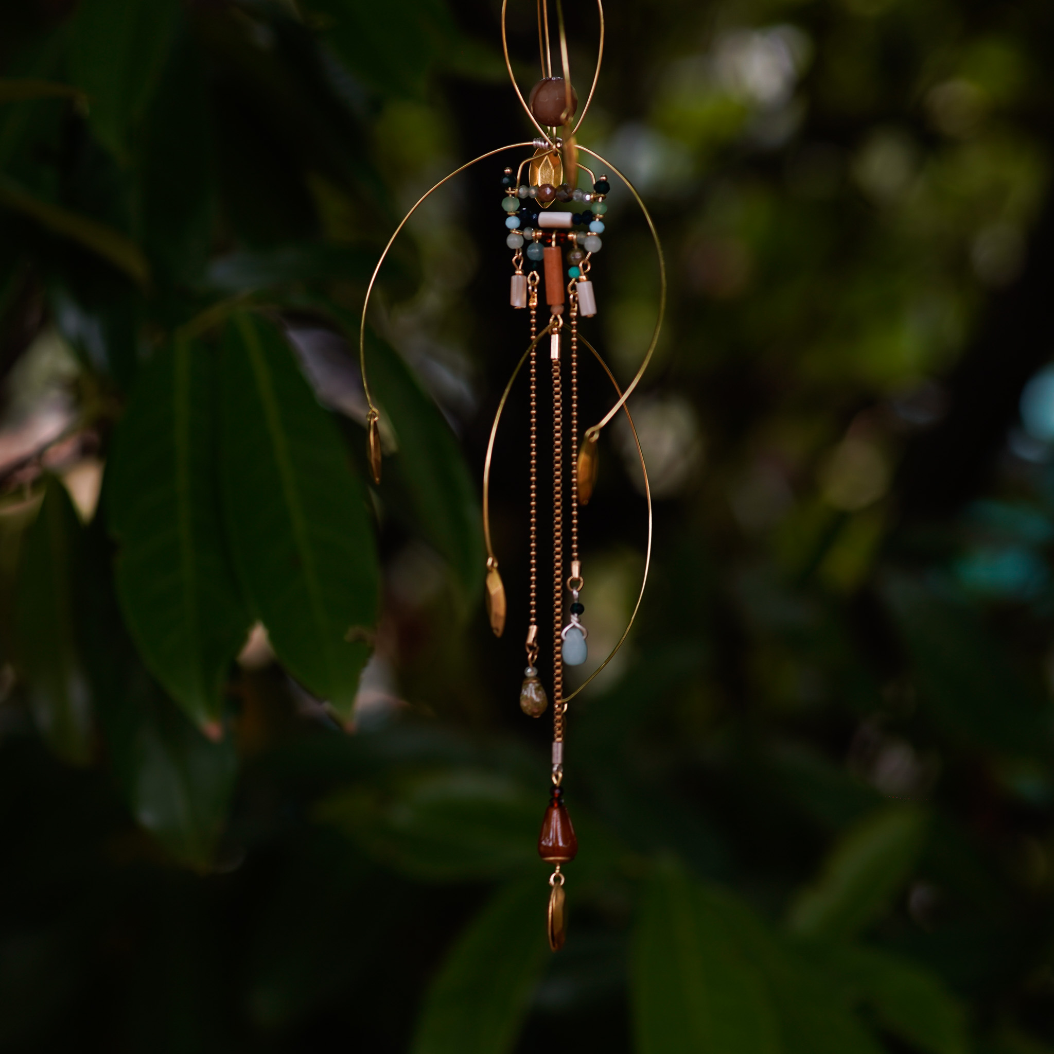 Réalisés à la main avec minutie, chaque suspension associe le fil en laiton, la douceur irisée de la nacre et l’éclat naturel des pierres semi-précieuses. Ces créations uniques évoquent la nature dans toute sa poésie