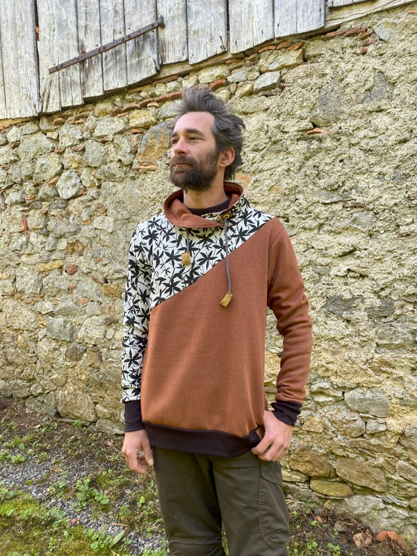 Sweat homme ou femme tricolore. Découpes originales. Grande poche kangourou à l’avant. Bord côte en bas de sweat et bas de manches avec un trou pour passer le pouce. Capuche doublée que l’on peut resserrer grâce à un cordon.