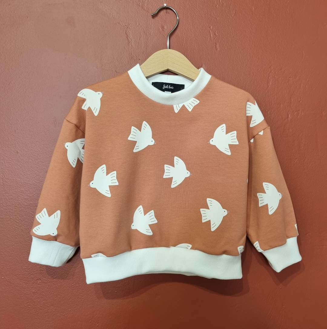 Sweat-shirt enfant ultra confortable Le sweat Aloïs a une coupe ample dite oversize. Il est confectionné dans un tissu sweat french-terry, motifs oiseaux sur fond rose corail. Manches longues tombant sur les épaules Encolure ronde Forme ample, longueur au bassin Tissu bord-côte à l’encolure, aux poignets et en bas du sweat colori crème Le sweat Aloïs est disponible du 02 au 10 ans, il est fabriqué de manière artisanale dans notre atelier de couture à Toulouse.