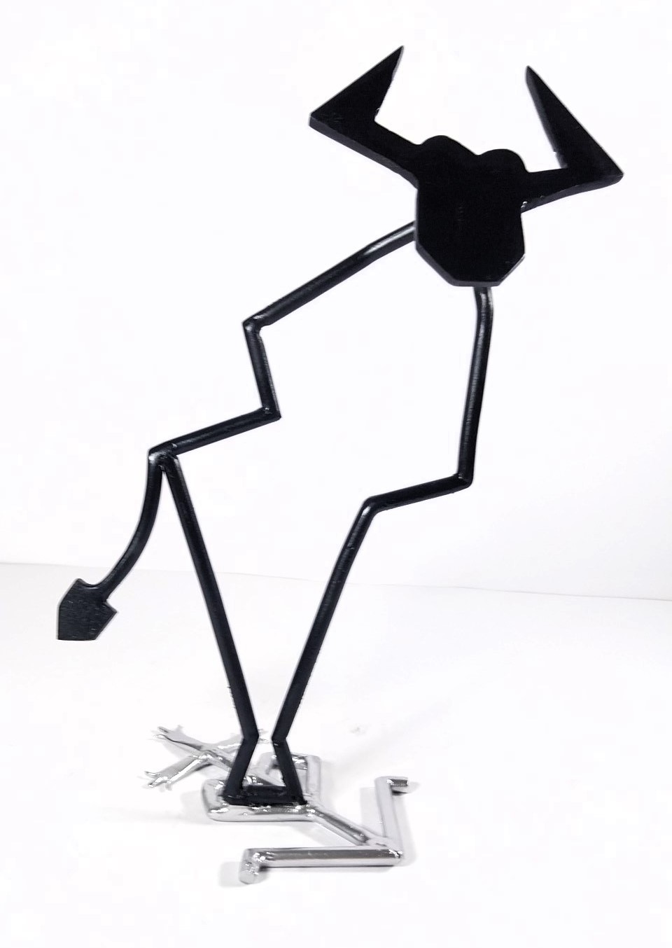 Taureau cubique en fer doux et tôle sur sa croix de Camargue en fer. Soudure à l’arc