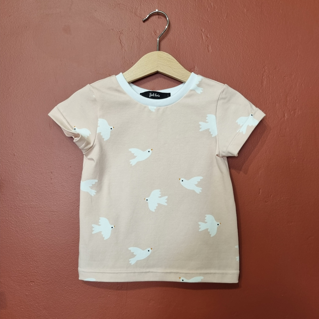Tee-shirt enfant en coton doux Tee-shirt à manches courtes de forme classique Encolure ronde Finitions bord côtes au col colori blanc Forme droite ajustée, longueur au bassin Jersey en coton doux imprimé oiseaux sur fond rose clair Tee shirt enfant disponible du 02 au 10 ans. Fabriqué de manière artisanale dans notre atelier de couture à Toulouse.