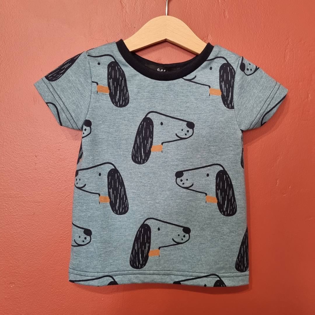 Tee-shirt enfant en jersey motifs chiens Tee-shirt enfant manches courtes Encolure ronde avec un tissu bord côtes colori bleu marine Forme droite ajustée, longueur au bassin Tissu jersey motifs chiens sur fond bleu chiné, en coton tout doux Tee-shirt enfant disponible du 02 au 10 ans, fabriqué de manière artisanale dans notre atelier de couture à Toulouse.