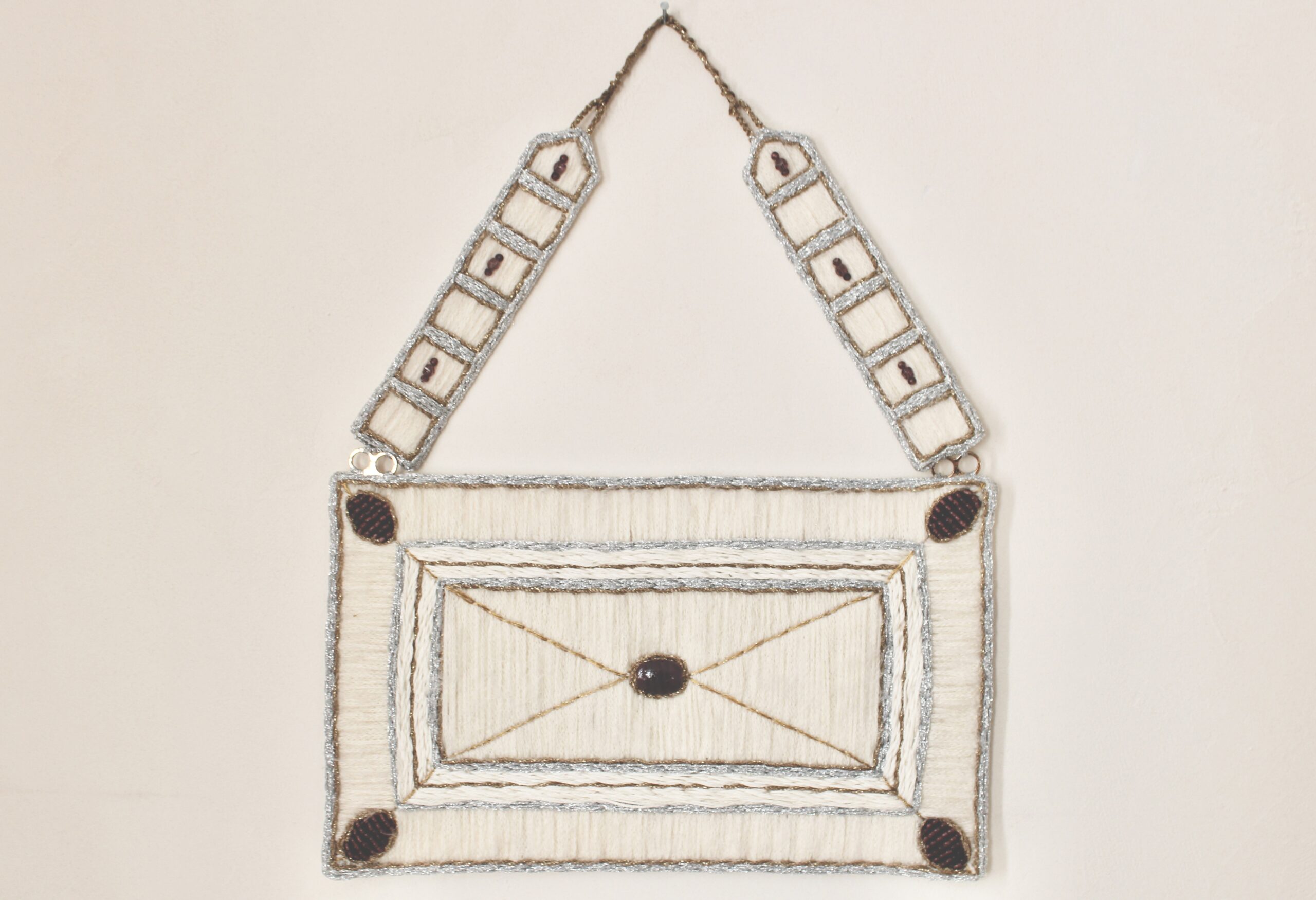 Plastron brodé avec de la laine blanche, des fils métallisés argentés et dorés. Ajout de perles de verre violettes. Largeur : 34 cm – Hauteur : 44 cm