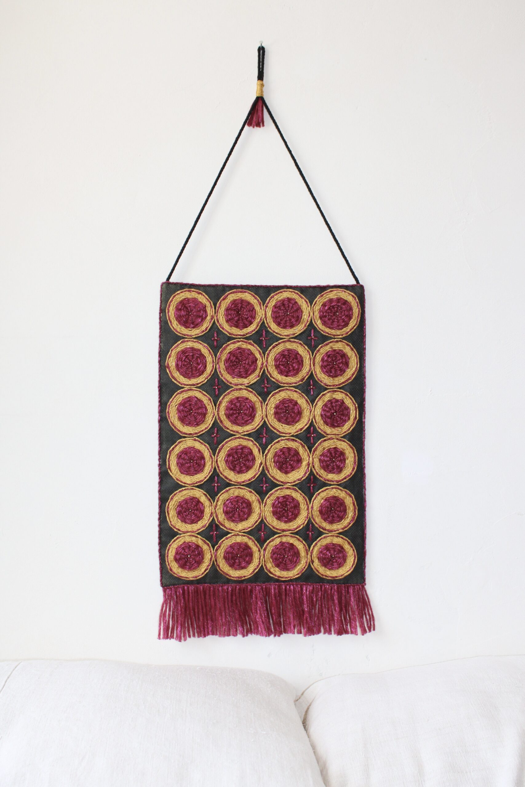Cette tenture brodée à la main est inspirée d’un tissu cérémoniel du Lac Posol (Indonésie). Elle est composée de laine Plassard « Patchouli » fushia, de coton jaune et de Phil Divin Gold. Hauteur : 83 cm – Largeur : 29cm