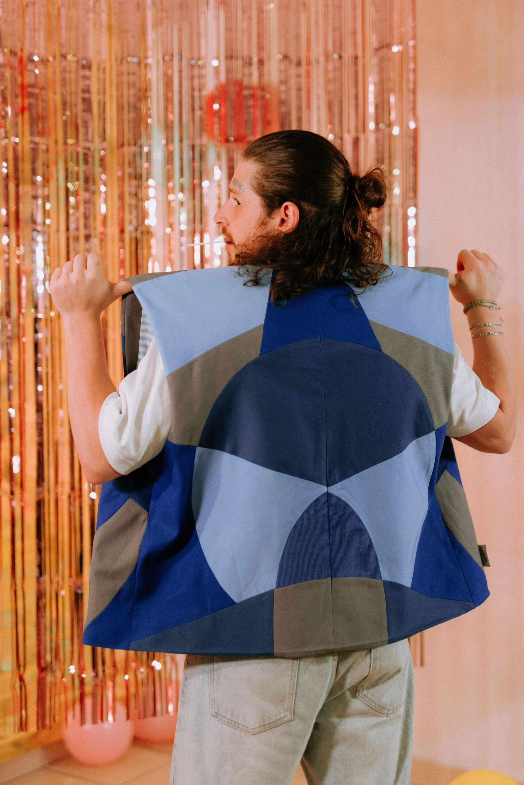 Le gilet sans manches prêt à poser son style, taillé pour celleux qui aiment se démarquer. Silhouette marquée : épaules larges, coupe oversize, entre haori et vestes 80s. Deux poches profondes et un lien à nouer pour doser l’allure. Chaque pièce est unique, pensée comme une œuvre textile. Plus qu’un gilet : une déclaration de style. 💥 – Il faut environ 6 pantalons pour créer ce patchwork de 40 pièces. Un travail artisanal de précision : 25 heures entre découpe, assemblage et finitions pour un résultat tout en courbes, biais et belles couleurs. – Tissus : Vêtements désuets démontés et recousus façon patchwork. Majoritairement coton, parfois du polyester : reflet de nos vestiaires passés.