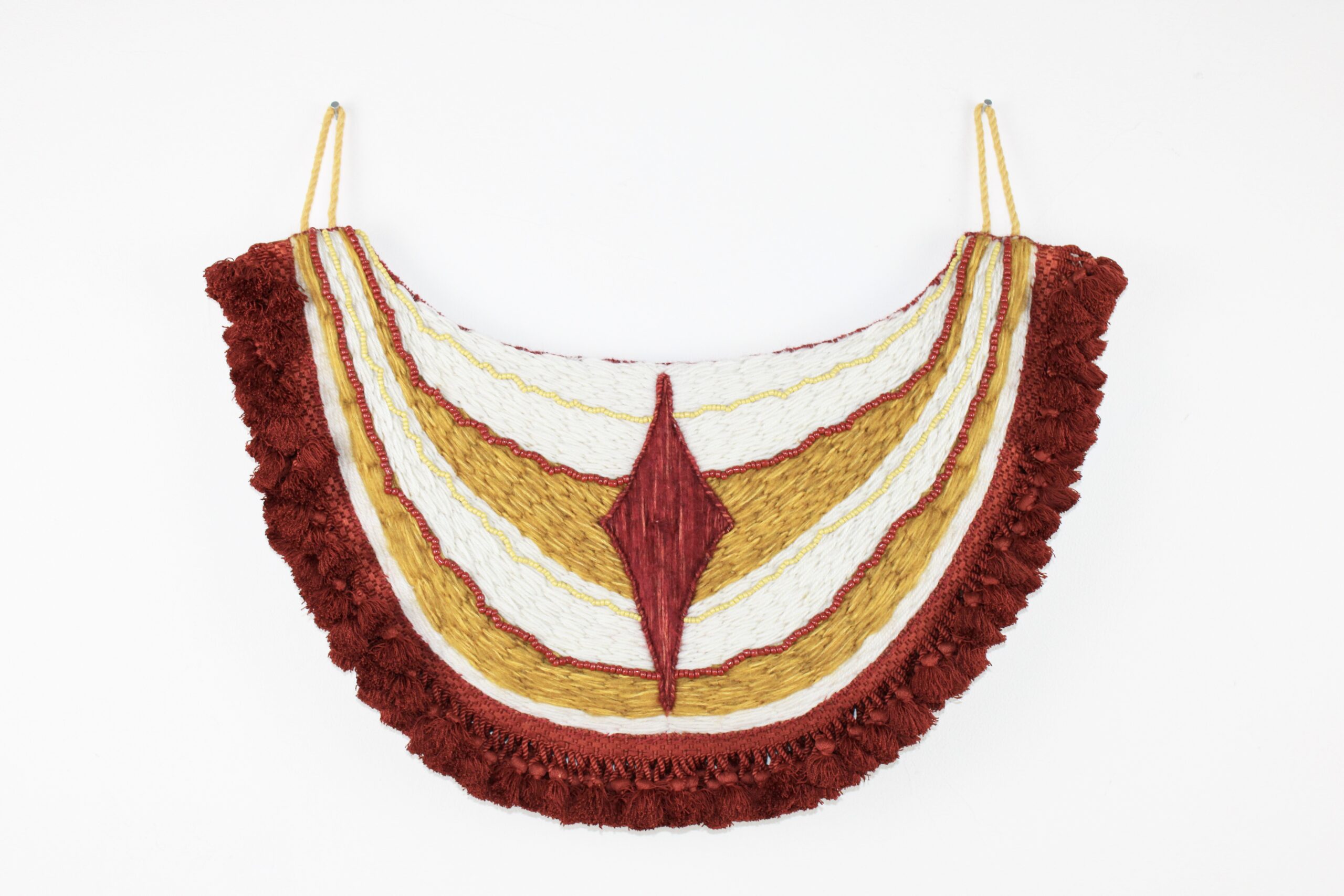 Plastron brodé à la main avec des laines Plassard « Nepture » (mohair, alpaga, coton) rouge, laine écrue, perles rouge et jaune et passementerie avec pompons rouge. Largeur 49cm – Hauteur : 38cm