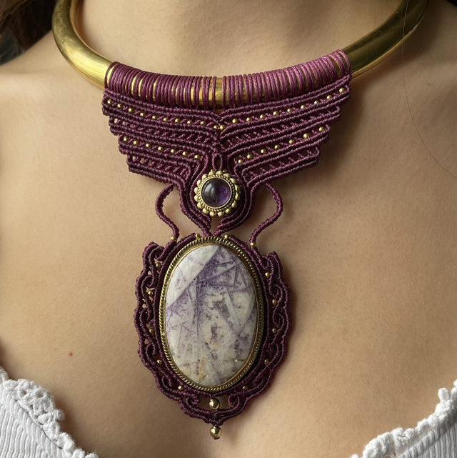 Torque en laiton doré sur lequel est réalisé à la main un tissage en micro macramé . Le fil utilisé est un fil plat de couleur prune . La pierre centrale est une Kammamérite sertie de laiton doré , au dessus trouve un cabochon d’améthyste serti de laiton doré . Les perles de finitions sont des rocailles miyuki dorées et des perles en acier inoxydable doré. Taille : Hauteur : 26 cms , Largeur : 15 cms , Poids : 92 g .