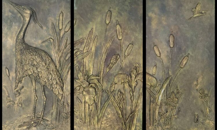 8 exemplaires signés numérotés 3 bas reliefs en plâtre peint à l’huile à la main 60 cm x 30 cm (soit 60cm x 90 cm) Egalement disponible en blanc ciré, imitation bronze, dorure et argenture.