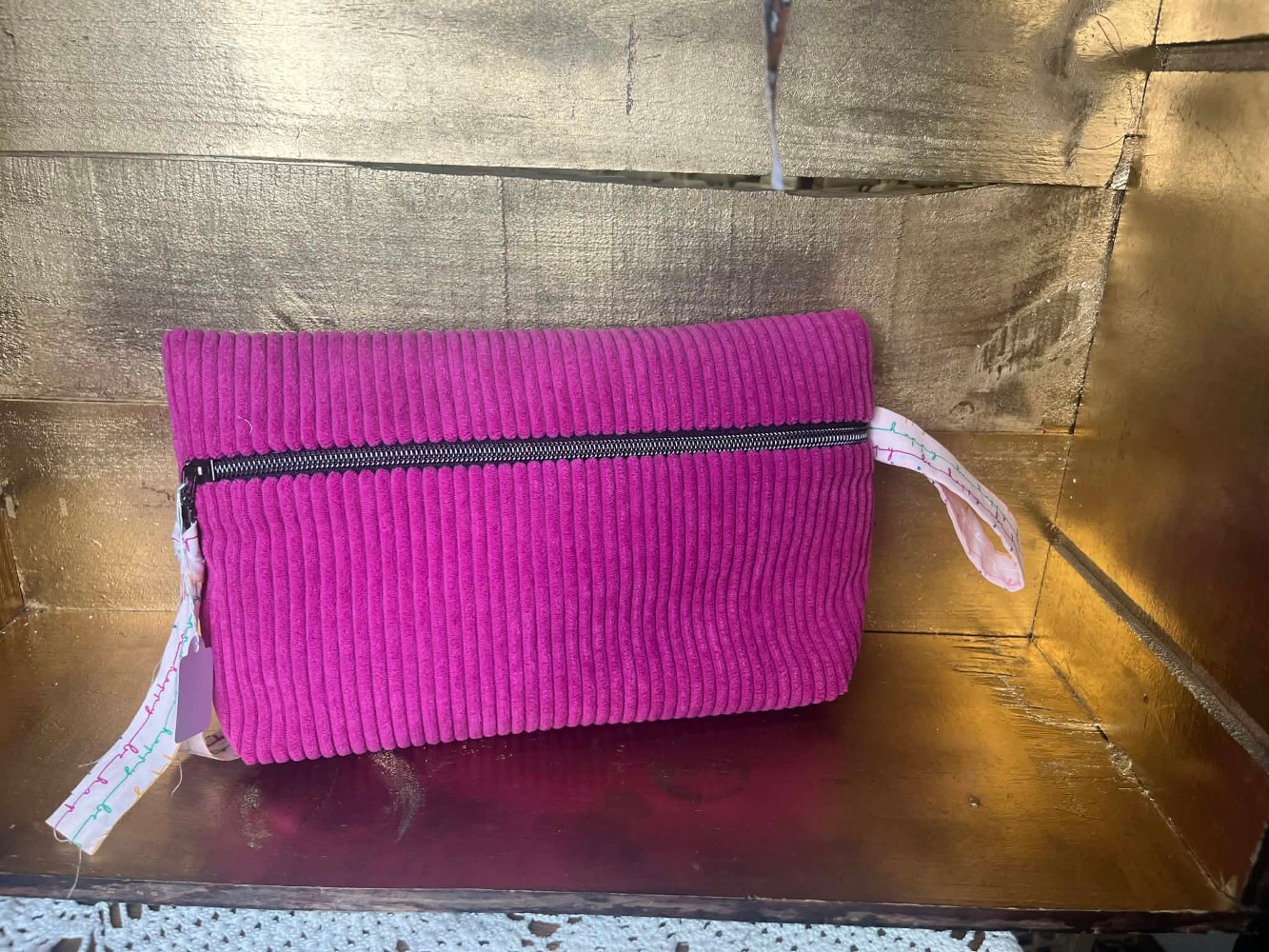 Je vous propose de découvrir en exclusivité mes TROUSSE MAQUILLAGE OU CE QUI NOUS PLAIT ! La trousse mesure 26 cm de large, 14 cm de hauteur et 6 cm de profondeur à sa base. Elle est ouatée quel que soit le modèle pour assurer une bonne tenue. Elle possèdent toutes un zip noir. Les modèles en velours côtelé de polyester sont doublés de popeline de coton. Les modèles en popeline de coton de tissu indien sont doublés du même tissu dans une couleur différente. Certains possèdent une languette décorative sur le côté et une languette décorative sur le zip, cette dernière est amovible. Il s’agit d’une pièce unique ! Je préconise un lavage à 30 degrés en machine et un séchage à l’air libre pour garder l’éclat de votre trousse dans le temps. Facile d’entretien, car elle passe à la machine ! J’ai réalisé cet ouvrage de A à Z, avec amour, dans mon atelier gardois, entre le Pont du Gard et le Pont d’Avignon. Je suis artisane d’Art, un gage de qualité.