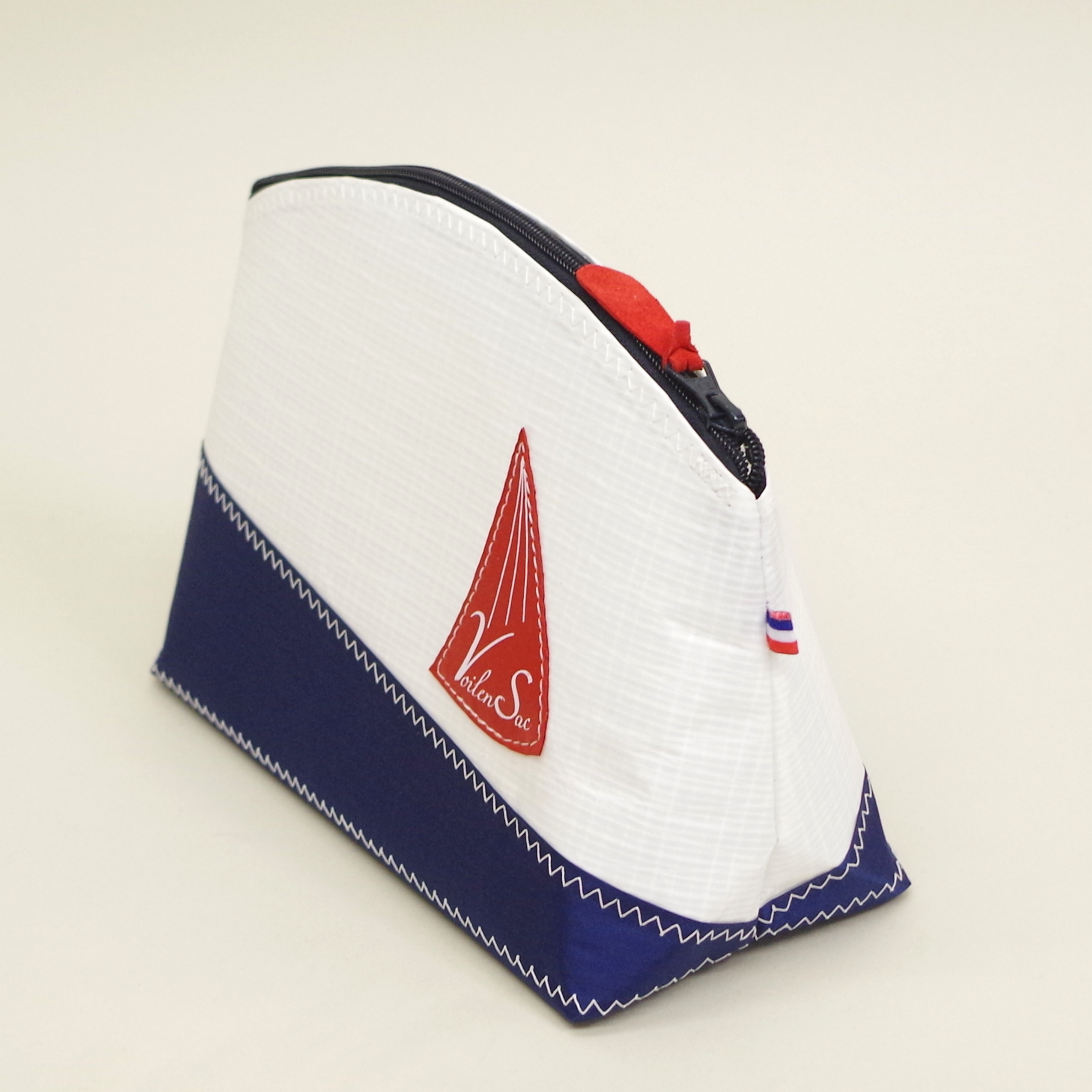 Trousse de toilette fabriquée en tissu à voile. Couleurs: Blanc, marine, logo rouge. Fermeture zippée avec tirette cuir. Base: 25 cm X 11 cm Hauteur: 19 cm