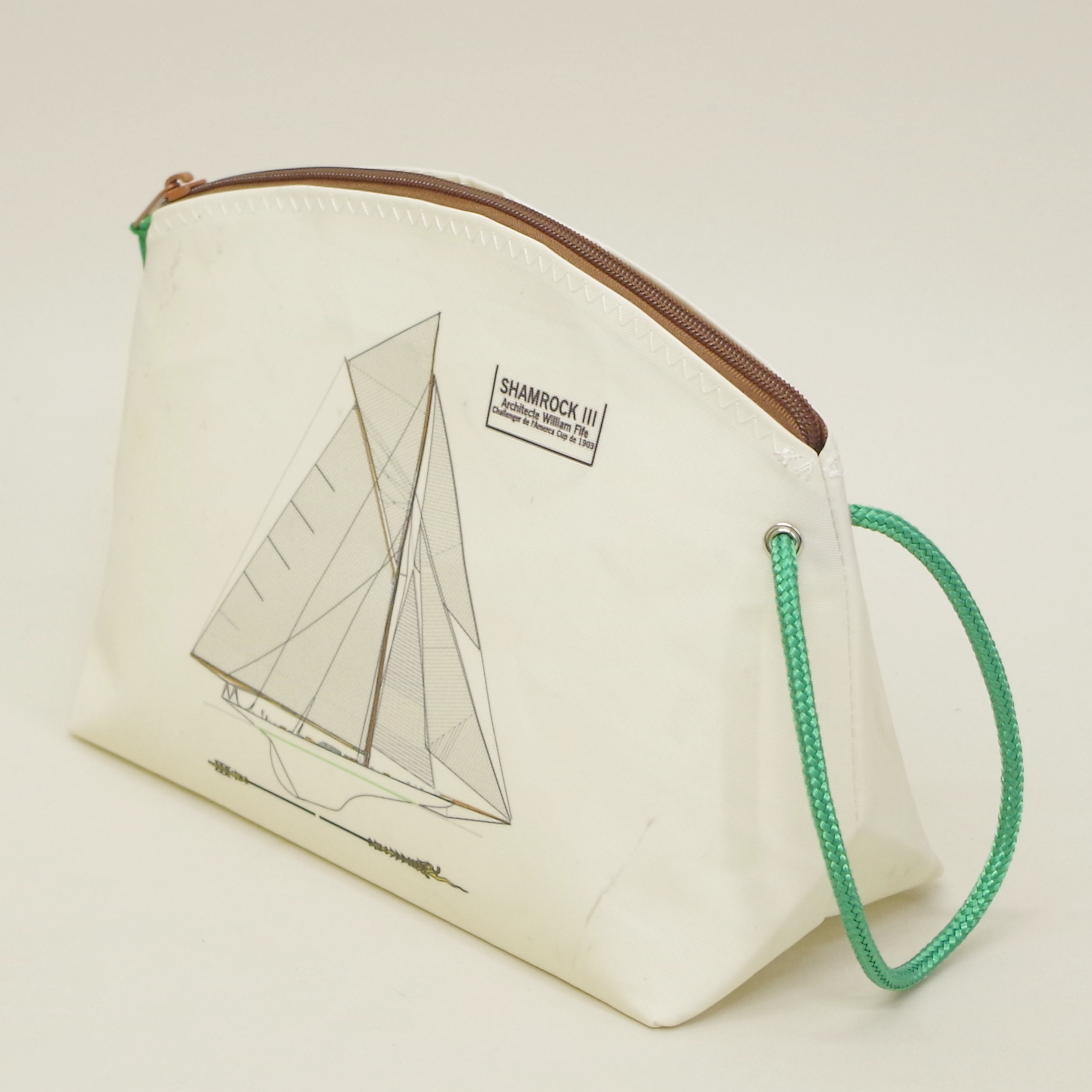 Trousse de toilette en voile bateau imprimée du plan du yacht classic Nan Of Fife Dragonne en cordage marin sur oeillets de voilerie en laiton nickelé, Base rectangulaire 25 cm X 11 cm, hauteur 19 cm. Vous avez le plan d’un bateau qui vous tient à coeur, je peux l’imprimer!