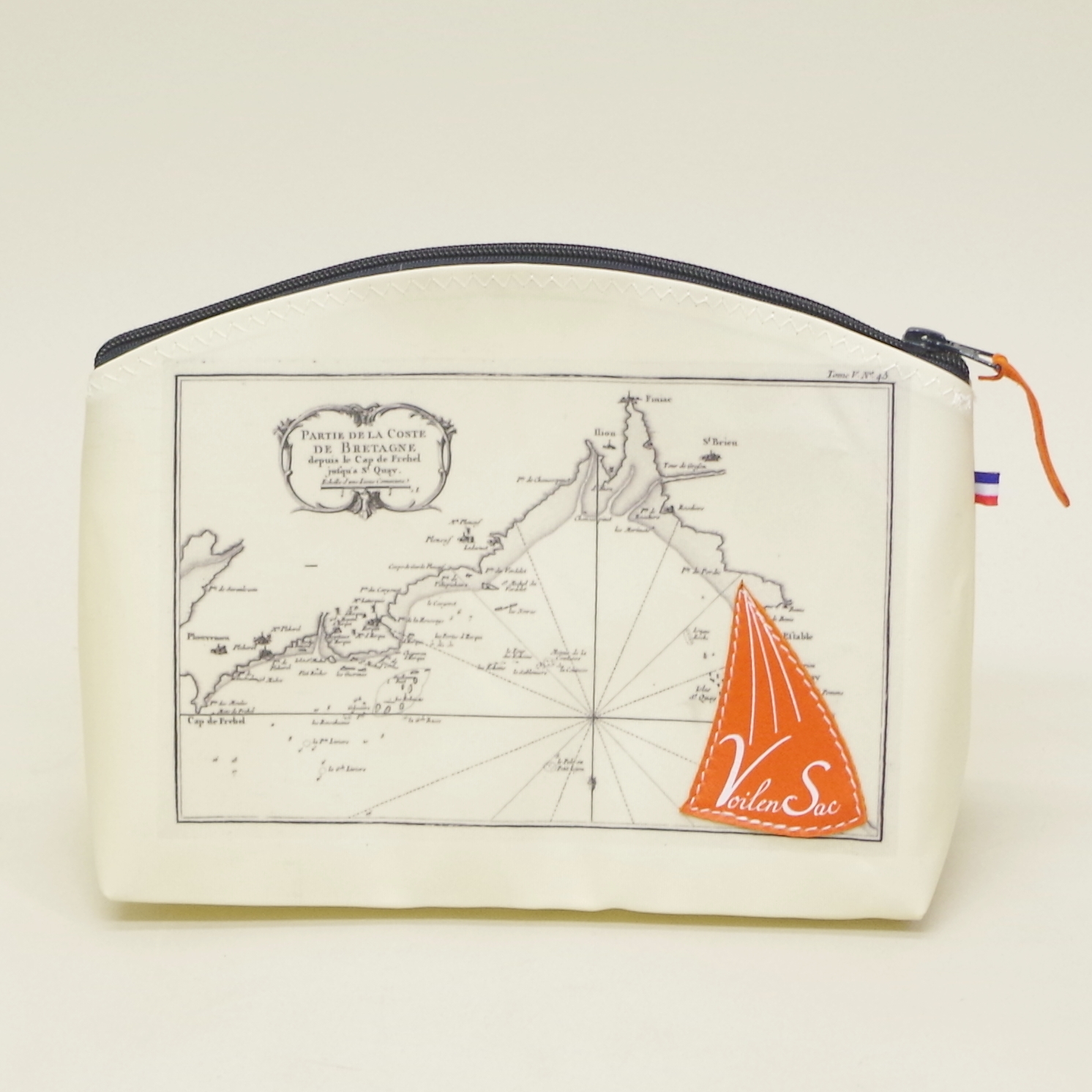 Trousse de toilette en voile bateau imprimée carte marine ancienne. Ici la bretagne du Cap Frehel à St Quay, Les motifs peuvent varier en fonction de la carte imprimée. Base rectangulaire 25 cm X 11 cm, hauteur 19 cm. J’ai probablement une carte de la région qui vous ferait plaisir! Contactez moi!!!