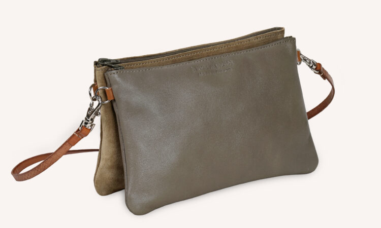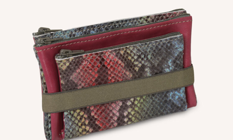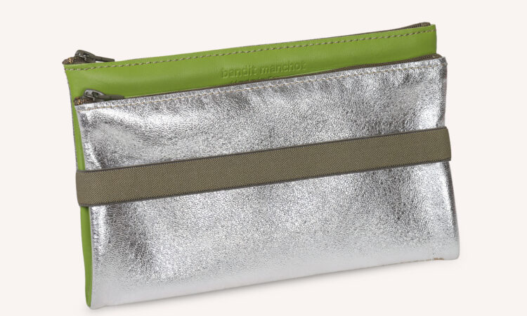 Cette double trousse est composée de deux pochettes zippées indépendantes, maintenues entre elles par deux pressions, ainsi que d’un emplacement pour carte. Elle peut accueillir papiers, cartes et petits objets du quotidien (clés, écouteurs, médicaments…). Son design se distingue par l’association de cuirs contrastés et d’un petit élastique rouge avec anneau, qui permet d’y accrocher un grigri ou un porte-clés, ou encore de l’accorcher à un sac à l’aide d’un lien ou d’un mousqueton. Elle est idéale en portefeuille, trousse ou petit organiseur, à glisser dans un sac. Pratique, durable et élégante, c’est un objet mixte à adopter au quotidien.