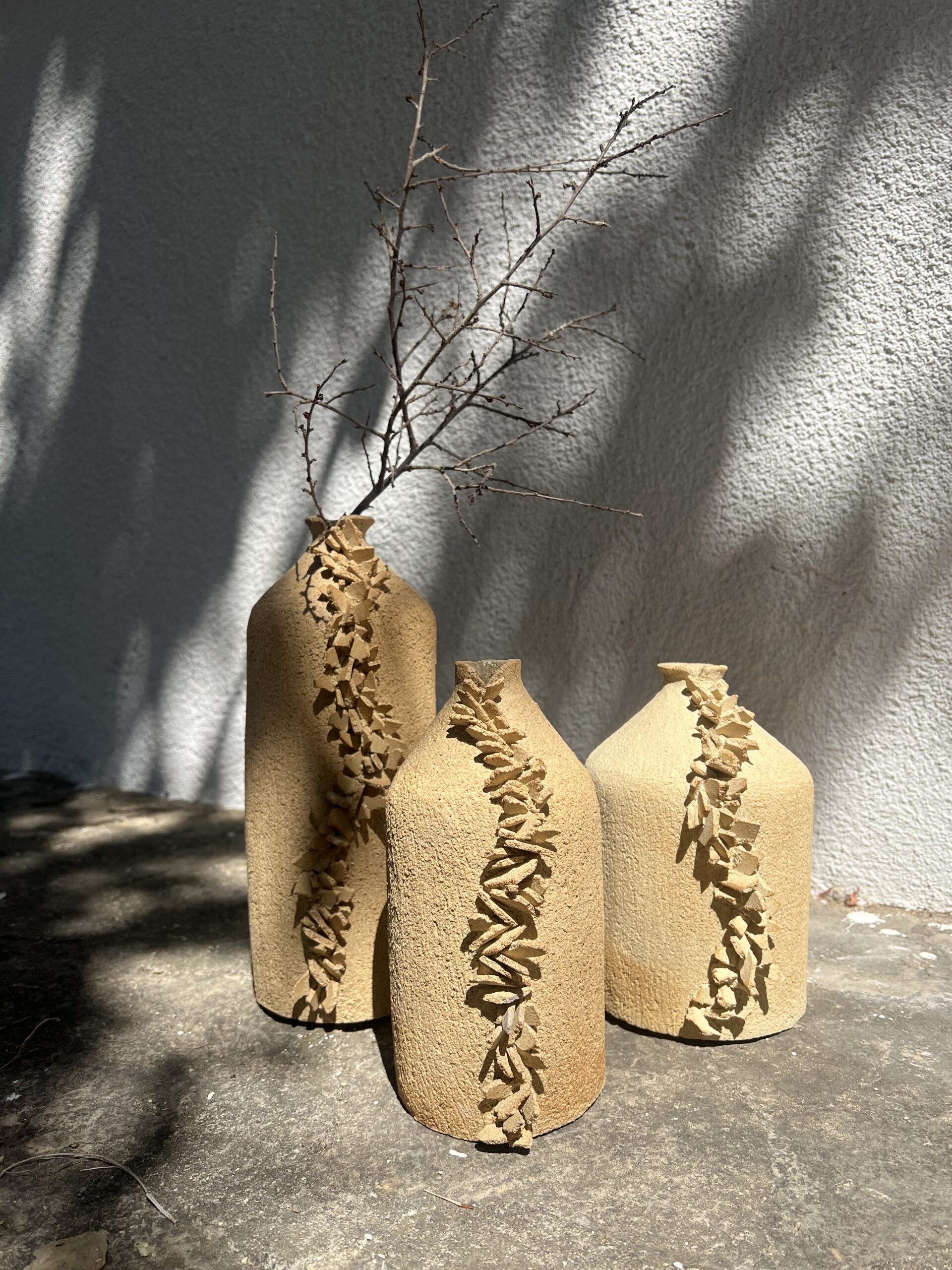 vase sculptural en grès roux chamotté. Il se distingue par sa texture brute et son décor organique qui évoque l’authenticité et la chaleur des matières naturelles. La collection ECLAT révèle la beauté brute de la matière tel un fragment de roche façonné par le temps. Un éclat de terre ou un éclat d’âme modelé lentement par cette technique ancestrale qu’est celle du colombin. Sa terre brute couleur terre chaude évoque les paysages méditerranéens : comme un souffle de nature pétrifié dans la terre. Inspirée par l’organique, cette collection célébre ici l’imperfection, le geste, l’émotion tactile. C’est une pièce unique. A exposer seule ou en série Elle est émaillé à l’intérieur et brut à l’extérieur : peut donc contenir de l’eau. Le grès utilisé est d’origine française