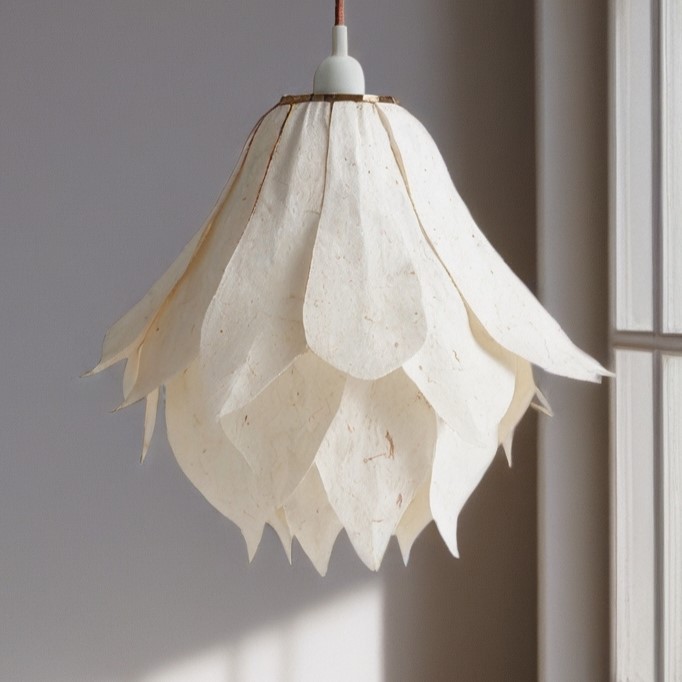Pièce unique en papier végétal, chaque élément est découpé et façonné à la main pour former cette lanterne blanche, pure comme une fleur de lumière éclose dans le silence.